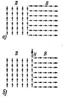 В этом нас убеждает ряд фактов. Прежде всего на это указывает зависимость магнитных свойств железа и других ферромагнитных материалов от обработки, изменяющей их кристаллическое строение (закалка, отжиг). Далее оказывается, что из парамагнитных и диамагнитных металлов можно изготовить сплавы, обладающие высокими ферромагнитными свойствами. Таков, например, сплав Гойслера, почти не уступающий по своим магнитным свойствам железу, хотя он состоит из таких слабо магнитных металлов, как медь (60%), марганец (25%) и алюминий (15%). С другой стороны, некоторые сплавы из ферромагнитных материалов, например сплав из 75% железа и 25% никеля, почти не магнитны. Наконец, самым веским подтверждением является то, что при достижении определенной температуры (точка Кюри) все ферромагнитные вещества теряют свои ферромагнитные свойства. Ферромагнитные вещества отличаются от парамагнитных не только весьма большим значением магнитной проницаемости и ее зависимостью от напряженности поля, но и весьма своеобразной связью между намагничиванием и напряженностью намагничивающего поля. Эта особенность находит свое выражение в явлении гистерезиса со всеми его следствиями: наличием остаточного намагничивания и коэрцитивной силы. В чем причина гистерезиса? Вид кривых рис. 8 и 9, - различие между ходом нарастания намагничивания ферромагнетика при увеличении поля Н и ходом его размагничивания при уменьшении Н,- показывает, что при изменении намагничивания ферромагнетика, т. е. при увеличении или уменьшении напряженности внешнего поля, ориентация и дезориентация элементарных магнитов не сразу следует за полем, а происходит с известным отставанием. Подробное изучение процессов намагничивания и размагничивания железа и других ферромагнитных веществ показало, что ферромагнитные свойства вещества определяются не магнитными свойствами отдельных атомов или молекул, которые сами по себе парамагнитны, а намагничиванием целых областей, называемых доменами,- небольших участков вещества, содержащих очень большое количество атомов. Взаимодействие магнитных моментов отдельных атомов ферромагнетика приводит к созданию чрезвычайно сильных внутренних магнитных полей, действующих в пределах каждой такой области и выстраивающих, в пределах этой области, все атомные магнитики параллельно друг другу, как показано на рис. 11. Таким образом, даже при отсутствии внешнего поля ферромагнитное вещество состоит из ряда отдельных областей, каждая из которых самопроизвольно намагничена до насыщения. Но направление намагничивания для разных областей различно, так что вследствие хаотичности распределения этих областей тело в целом оказывается в отсутствии внешнего поля ненамагииченным. Под влиянием внешнего поля происходит перестройка и перегруппировка таких «областей самопроизвольного намагничивания», в результате которой получают преимущество те области, намагничивание которых параллельно внешнему полю, и вещество в целом оказывается намагниченным. Один из примеров такой перестройки областей самопроизвольного намагничивания показан на рис. 11. Здесь схематически изображены две смежные области, направления намагничивания которых перпендикулярны друг к другу. При наложении поля Н часть атомов области В, в которой намагничивание перпендикулярно к полю, на г