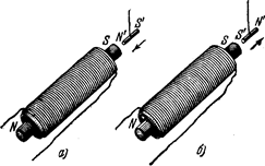 Рис. 2. а) При намагничивании парамагнитного или ферромагнитного тела на ближайшем к магниту конце возникает полюс, разноименный с полюсом намагничивающего магнита. Парамагнитное тело притягивается к магниту, б) В тех же условиях на ближайшем к магниту конце диамагнитного тела возникает полюс одноименный. Диамагнитное тело отталкивается от магнита. В отличие от тел парамагнитных диамагнитные тела уменьшают магнитный поток катушки. Это означает, что в диамагнитном теле под действием внешнего поля возникают элементарные круговые токи такого направления, что их магнитное поле противоположно направлению внешнего магнитного поля. Следовательно, и действие внешнего магнитного поля на диамагнитные тела противоположно по направлению действию его на тела ферро-и парамагнитные, т. е. диамагнитные тела отталкиваются от магнита (рис. 2, б).