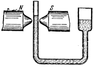 Рис.3 Рис.4 Мы можем выразить этот факт и несколько иначе. Когда мы подносим к магниту какое-нибудь железное тело, то оно намагничивается так, что на той стороне его, которая обращена к магниту, возникает полюс, разноименный с полюсом магнита; то же имеет место и в случае парамагнитного тела (рис. 2, а). Напротив, в случае диамагнитного тела на стороне, ближайшей к полюсу намагничивающего магнита, возникает полюс, одноименный с этим полюсом магнита (рис. 2, б). Рис. 3 и 4 поясняют, почему парамагнитные тела притягиваются к магниту, а диамагнитные отталкиваются от него. Именно такие действия и были обнаружены Фарадеем. В 1845 г., использовав сильный электромагнит, Фарадей установил способность всех тел намагничиваться и открыл, что одни тела притягиваются к магниту, а другие отталкиваются от него. Он предложил для первых название парамагнитных, для вторых название диамагнитных. Индукционные опыты с пара- и диамагнитными телами, были произведены значительно позже, когда магнитные свойства диамагнитных и парамагнитных тел были уже установлены на основании исследований Фарадея. По силе притяжения или отталкивания можно судить и количественно о способности тела намагничиваться, т. е. можно определить величину магнитной проницаемости для данного вещества. Этот метод измерения величины , основанный на изучении притяжения или отталкивания маленького тела из данного вещества, теоретически более сложен, чем описанный ранее метод, основанный на измерении э. д. с. индукции. Но зато он гораздо чувствительнее и, кроме того, пригоден для измерения , в маленьком образчике вещества, тогда как для измерения М по индукционному способу нужно заполнить изучаемым веществом всю внутренность катушки. В тех случаях, когда удается измерить и тем и другим способом, получаются согласующиеся результаты. Пример 1: Полюсы сильного электромагнита на рис. 3 срезаны не параллельно друг другу, так что внизу расстояние между ними значительно меньше, чем наверху. Между ними подвешивается на нити шарик из различных испытуемых материалов. Верхний конец нити прикреплен к спиральной пружинке, растяжение которой позволяет измерить силу, действующую со стороны магнитного поля на шарик (пружинные весы). Оказывается, что если шарик изготовлен из алюминия, вольфрама или платины, то эта сила направлена вниз (пружинка растягивается), а в случае серебра, золота, меди или висмута она направлена вверх (пружинка сокращается). Пример 2: При исследовании магнитной проницаемости жидких тел часто поступают так. Жидкость наливают в коленчатую трубку и одно из колен помещают между полюсами сильного электромагнита (рис 4).Жидкость в этом колене поднимается или опускается в зависимости от того, является ли она парамагнитной или диамагнитной. Молекулярная теория магнетизма. Теория, объясняющая различие в магнитных свойствах веществ на основе изучения строения отдельных частиц этих веществ - их атомов или молекул,- получила название молекулярной теории магнетизма. Эта теория очень сложна и во многом еще не завершена. Поэтому здесь мы не можем разбирать ее сколько-нибудь подробно. Укажем лишь на основные причины различия между свойствами парамагнитных и диамагнитных тел. Каждое тело, и парамагнитное и диамагнитное, представляется нам в целом ненамагниченным до тех пор, пока на него не дей