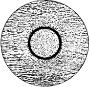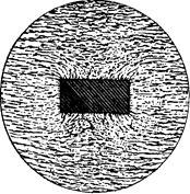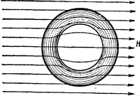 Рис. 5 Изменение магнитного поля при внесении в него куска железа. Как видим, поле перестает быть однородным и приобретает сложный характер: в одних местах оно усиливается, в других - ослабляется. Очень интересно и практически важна картина, которая наблюдается при внесении в магнитное поле замкнутого железного сосуда, например шаровой формы. Как видно из рис.6, в результате сложения внешнего магнитного поля с полем намагнитившегося железа поле во внутренней области шара почти исчезает. Этим пользуются для создания магнитной защиты или магнитной экранировки, т. е. для защиты тех или иных приборов от действия внешнего магнитного поля. Картина, которую мы наблюдаем при создании магнитной защиты, внешне напоминает создание электростатической защиты при помощи проводящей оболочки. Однако между этими явлениями есть глубокое принципиальное различие. В случае электростатической защиты металлические стенки могут быть сколь угодно тонки. Достаточно, например, посеребрить поверхность стеклянного сосуда, помещенного в электрическом поле, чтобы внутри сосуда не оказалось электрического поля, которое обрывается на поверхности металла. В случае же магнитного поля тонкие железные стенки не являются защитой для внутреннего пространства: магнитные поля проходят сквозь железо, и внутри сосуда оказывается некоторое магнитное поле. Лишь при достаточно толстых железных стенках ослабление поля внутри полости может сделаться настолько сильным, что магнитная защита приобретает практическое значение, хотя и в этом случае поле внутри не уничтожается целиком. И в этом случае ослабление поля не есть результат обрыва его на поверхности железа; магнитные силовые линии отнюдь не обрываются, но по-прежнему остаются замкнутыми, проходя сквозь железо.