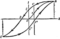 {Ветвь ОА изображает ход намагничивания исходного ненамагниченного материала и не повторяется при повторных циклах. Для того чтобы вновь воспроизвести ветвь ОА, необходимо привести материал в первоначальное ненамагниченное состояние. Для этого достаточно, например, сильно нагреть его.} Из рис. 8 видно, что эта кривая, изображающая ход зависимости намагничивания железа J от напряженности внешнего поля H, имеет вид петли. Ее называют петлёй гистерезиса для данного сорта железа или стали. Форма петли гистерезиса является важнейшей характеристикой магнитных свойств того или иного ферромагнитного материала. В частности, зная ее, мы можем определить такие важные характеристики этого материала, как его магнитное насыщение, остаточное намагничивание и коэрцитивную силу.