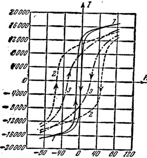 Изображая графически распределение силовых линий в толще железа и в полости, получим картину рис.7 которая и показывает, что ослабление поля внутри полости есть результат изменения направления силовых линий, а не их обрыва. Особенности ферромагнитных тел. Бросающейся в глаза особенностью ферромагнитных тел является их способность к сильному намагничиванию, вследствие которой магнитная проницаемость этих тел имеет очень большие значения. У железа, например, величина достигает значений, которые в тысячи раз превосходят значения у парамагнитных и диамагнитных веществ. Намагничивание ферромагнитных тел было изучено в опытах А. Г. Столетова и других ученых. Эти опыты показали, сверх того, что, в отличие от парамагнитных и диамагнитных веществ, магнитная проницаемость ферромагнитных веществ сильно зависит от напряженности магнитного поля, при которой производят ее измерение. Так, например, в слабых полях магнитная проницаемость , железа достигает значений 5—6 тысяч, а в сильных полях значения , падают до нескольких сот и ниже. Намагничивание тела, помещенного в магнитное поле, например, внутрь соленоида с током, вызывает изменение магнитного потока. Поэтому величину намагничивания материала можно характеризовать разностью между тем магнитным потоком, который дает соленоид с сечением в 1 см2, заполненный данным веществом, и тем потоком, который дает при том же токе этот соленоид без сердечника в воздухе (или, точнее, в вакууме). Если пустой соленоид дает поток Фо, а заполненный — поток Ф, то, согласно теории магнитной проницаемости, Ф= Фо. Таким образом, величина J=Ф-Фо= ( - 1)*Фо представляет собой тот добавочный магнитный поток, который создается намагниченным веществом. Эту величину мы и будем называть намагничиванием данного вещества. Намагничивание зависит от магнитной проницаемости вещества и от величины потока Фо, в котором производится намагничивание. Обращается внимание на то, что мы выбираем соленоид с определенной площадью сечения (1 см2), ибо величина потока зависит от площади сечения соленоида. В разделе магнитная проницаемость, когда нас интересовало отношение потоков Ф/Фо, это обстоятельство не имело значения, ибо величина площади сечения входит и в числитель и в знаменатель этого отношения. Но за меру намагничивания мы выбрали разность этих потоков; поэтому сечение соленоида должно быть вполне определенное и мы условимся брать его равным 1 см2. Изучение зависимости намагничивания железа и других ферромагнитных материалов от напряженности внешнего магнитного поля обнаруживает ряд особенностей этих веществ, имеющих важное практическое значение. Возьмем кусок ненамагниченного железа, поместим его в магнитное поле и будем измерять намагничивание железа J, постепенно увеличивая напряженность внешнего магнитного поля H. Намагничивание J возрастает сначала резко, затем все медленнее и, наконец, при значениях H около нескольких сот эрстед намагничивание перестает возрастать: все элементарные токи уже ориентированы, железо достигло магнитного насыщения. Графически зависимость величины J(H) в описываемом опыте изображается кривой ОА на рис. 8. Горизонтальная часть этой кривой вблизи А соответствует магнитному насыщению. Достигнув насыщения, начнем ослаблять внешнее магнитное поле. При этом намагничивание железа 