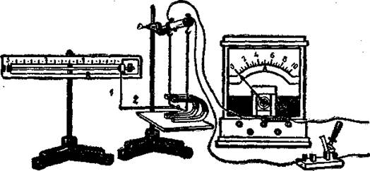Для измерения силы, действующей на проводник с током, служат универсальные чувствительные весы. При подготовке их к измерению в отверстие втулки весов вставляют стержень l (рис. 1) с малым диском из аэродинамического набора и изготовляют рейтер массой в 500 мг в виде согнутой металлической полоски. Толкателем 2, соединяющим весы со скобой, служит мягкая тонкая проволочка, один конец которой огибают вокруг стержня над самым диском, а другой конец, согнутый в виде крючка, свободно накладывают на середину скобы между магнитами. При определении цены деления весов надо применить правило моментов. Если длина стержня 10 см, а рейтер весом 0,005 Н находится, например, на расстоянии 20 см от оси, то