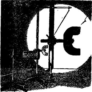Если двигать над прибором полюс магнита и этим способом привести магнитики в быстрое вращение, то они вновь образуют по-разному ориентированные группы. Подобно этому происходит размагничивание образца в переменном магнитном поле при ударах, при нагревании. При выполнении этой модели главное внимание надо обратить на изготовление магнитиков. Их нарезают длиной по 12 мм из стальной проволоки диаметром 5 мм. В середине заготовленного цилиндрика сверлят глухое отверстие диаметром 2 мм, не доходя до конца на 1 - 1,5 мм (рис. 9). Чтобы вершина отверстия для иглы была более узкой, полезно сделать небольшую дополнительную сверловку тонким сверлом (0,5 - 0,8 мм). Если изготовленный цилиндрик не уравновешивается в горизонтальном положении, более тяжелый конец подпиливают сверху или снизу (образовавшиеся плоскости на проекции не будут видны). После этого все цилиндрики закаливают и намагничивают при помощи электромагнита, собранного из деталей универсального трансформатора. РАЗМАГНИЧИВАНИЕ СТАЛЬНОГО ОБРАЗЦА ПРИ НАГРЕВАНИИ Оборудование: 1) магнит постоянный, 2) шуруп или гвоздь железный на нихромовой проволоке, 3) штатив универсальный, 4) горелка газовая, 5) осветитель для теневой проекции. На универсальном штативе закрепляют сильный магнит и на тонкой нихромовой проволоке подвешивают небольшой железный шуруп или гвоздь, как показано на рисунке 10. Шуруп должен притягиваться полюсом магнита и удерживаться на рас стоянии 2 - 3 см от него, а проволока с подвешенным шурупом - образовывать угол 30° с вертикалью. Затем