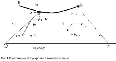 Силу, действующую на электрон, можно представить как сумму двух сил: Frz – силы, действующей со стороны радиальной слагающей поля Hr на электрон, имеющий скорость Vr. Направление обеих сил одинаково, но вследствие параксиальности электронных лучей Vz>>Vr и