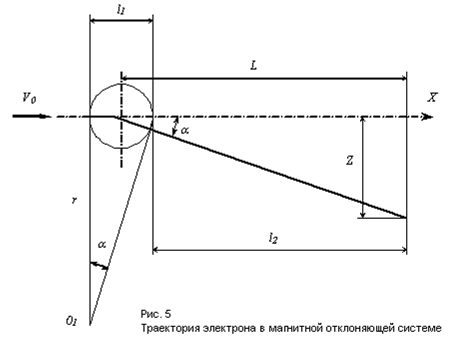 По выходе из магнитного поля электрон продолжает движение по касательной к его криволинейной траектории в точке выхода из поля. Он отклонится от оси трубки на некоторую величину z = L tga. При малых углах a » tg a; z » La.