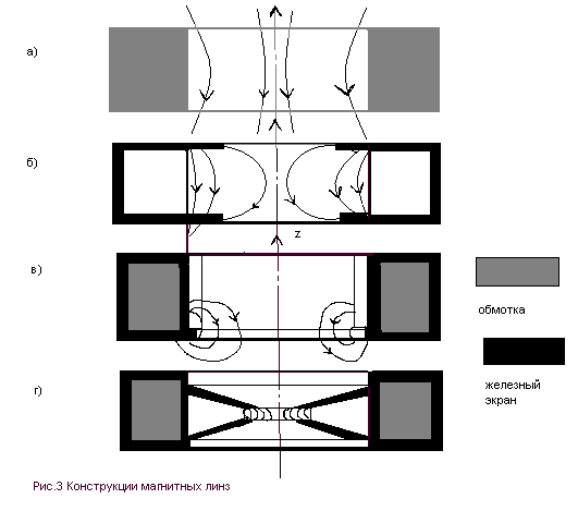 0 . При повторной встрече электрона с этой силовой линией в точке В Ег по-прежнему будет оказывать на него ускоряющее действие, а Ев будет способствовать расфокусировке. Но вертикальная составляющая в точке В меньше, чем в точке А, так как электрон вылетает из неоднородного электронного электрического поля, прижатым к оси. Кроме того, в районе точки В он имеет большую скорость, чем в районе точки А, поэтому отклоняющая сила воздействует на электрон меньший промежуток времени. Следовательно, фокусирующее действие неоднородного электрического поля оказывается преобладающим. Аналогично действует на световой луч оптическая система, состоящая из собирательной и рассеивающей линз при условии, что оптическая сила собирающей линзы больше рассеивающей (рис.2в) ). 2.1 Магнитные фокусирующие линзы Задача превращения потока электронов в тонкий электронный луч, обладающий в плоскости экрана минимальным поперечным сечением и большой плотностью тока, решается с помощью электростатических и магнитных линз, образуемых специальными электродами, составляющими фокусирующую систему электроннолучевой трубки. Далее будет рассматриваться магнитные линзы. 2.2 Типы магнитных линз. Форма поля в магнитных линзах Длинная магнитная линза представляет собой просто однородное магнитное поле, параллельно которому направлена ось фокусируемого расходящегося пучка электронов. Длинная линза даёт прямое изображение объекта, многократно повторяющееся на равных расстояниях, причём как объект, так и его изображение лежат внутри поля. Длинная магнитная линза мало похожа на оптические и электростатические электронные линзы: она не преломляет лучей, параллельных полю, и, значит, не имеет ни фокусов, ни главных точек и не может давать ни увеличенного, ни уменьшенного изображения. Обширное применение имеют магнитные линзы, образованные неоднородным аксиальносимметричным полем. На рис. 3 даны меридианные сечения некоторых магнитных линз этого класса и форма силовых линий в меридианной плоскости. простейшая, но очень слабая магнитная линза – это кольцевой ток. Напряжённость поля на оси кольцевого тока радиуса R, как можно очень показать, исходя из закона Био-Савара, выражается формулой