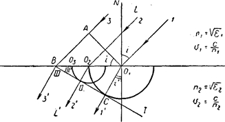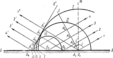 Рис 1 На рисунке 1 изображена схема, объясняющая отражение плоской световой волны Е от плоской границы раздела SS двух оптически разнородных сред. Цифрами /, 2, 3, 4, ... обозначены параллельные лучи, вдоль которых распространяется энергия волны, один из плоских фронтов которой изображен прямой (следом) Е, нормальной к лучам. Расстояния между лучами /, 2, 3, 4, ... выбраны равными между собой. Световые колебания, бегущие вдоль луча /, возбуждают в точке Ог элементарную сферическую волну /, которая за время At пробегает путь 01А — сАt. Аналогичные световые колебания возбуждают в точках 02, 03, 04, ... элементарные сферические волны //, ///, IV, ... . За время Аt колебание, идущее вдоль луча 2, пробежит путь ОA2, и после встречи с поверхностью SS сферическая волна // пройдет расстояние О2A2, причем 02А'2 + 02A2 = О1А1. Точно так же будем иметь: 03А'3 + 03A3 = О1А1 и т. д. Вследствие этого элементарные сферические волны /, //, ///, IV, ... будут иметь общую касательную поверхность Е', которая касается элементарных волн /, //, ///, IV, ... в точках A1, А2, А'3, A4', ... . Эта общая касательная поверхность и будет представлять поверхность отраженной световой волны. Из геометрических соотношений нетрудно показать, что угол падения I равен углу отражения I ', луч падающий и отраженный находятся в одной плоскости с перпендикуляром, опущенным на поверхность раздела в точке падения. Если отражение происходит от кривых поверхностей, то закон отражения в той форме, в которой он здесь сформулирован, применяется к бесконечно малым участкам поверхности, которые могут приниматься с очень большой степенью приближения за плоские. Практическое применение этого закона будет сделано в приложении к сферическим зеркалам. При отражении света на границах раздела двух сред всегда имеет место неполное отражение, так как какое-то количество света проходит в среду, от границы с которой и происходит отражение. Если эта среда слабо поглощает, то частично прошедший свет распространяется в ней на большие расстояния. В случае поглощающей среды проникший в нее свет быстро поглощается, а его энергия обычно происходит по внутреннюю энергию среды. Возможны и другие превращении световой энергии, проникшей во вторую среду. Введем обозначения: R — коэффициент отражения; А — коэффициент, определяющий поглощение света средой после его проникновения в псе (среда полностью поглощает прошедшее в нее излучение), тогда R+A=1 Величины R и А могут иметь самые различные значения. R. достаточно велико у полированных поверхностей металлов или у металлических пленок, нанесенных на полированные поверхности диэлектриков (у серебра в видимой и инфракрасной области. Рассмотрим теперь явление преломления света. Оно происходит на границе раздела двух сред. При прохождении через границу луч света испытывает скачкообразное изменение направления распространения. Это явление и называется преломлением света. Наряду с этим наблюдаются явления так называемой рефракции, т. е. плавного изменения направления распространения, когда в среде имеет место градиент показателя преломления . Преломление света подчиняется следующему закону: отношение синуса угла падения к синусу угла преломления равно отношению абсолютных показателей преломления второй и первой среды; лучи падающий и преломленный лежат в одной плоскости с перпендикуляром, опущенным на поверхность 