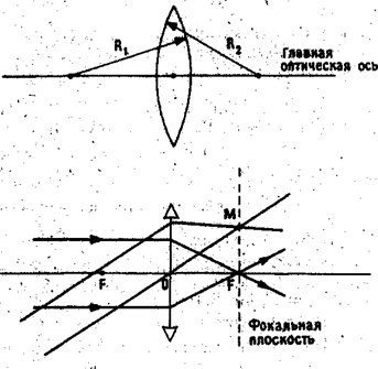 O1C SIN I= ------ O1 B следовательно SIN i AB V1t ------ = ----- = SIN i O1C V2t Следовательно V1 ----- = n1,2 V2 Где n- абсолютные показатели преломления веществ. ЛИНЗЫ Линза представляет собой прозрачное тело, ограниченное криволинейными поверхностями. Простейшая линза —- сферическая. Преломление лучей при прохождении их через линзу строго определяется законами преломления. Расчеты, проводимые на основании этих законов показывают, что линзы можно разделить на два типа: собирающие ни рассеивающие Рассмотрим тонкую линзу, т. е. линзу, максимальная толщина которой значительно меньше ее радиусов кривизны (рис. 3). Главной оптической осью называется прямая, проходящая через центры сферических поверхностей, ограничивающих линзу. Радиусы этик сфер называются радиусами кривизны, Фокусом линзы называется точка пересечения F преломленных линзой лучей, падающих параллельно равной оптической оси. Плоcкость, проходящая через фокус перпендикулярно главной оптической оси, называется фокальной плоскостью. Оптическим центром линзы называется точка, при прохождении через которую любой луч преломляется таким образом, что направление его распространения не изменяется. Оптический центр — это точка пересечения главной оптической оси с тонкой линзой. Другие прямые, проходящие через