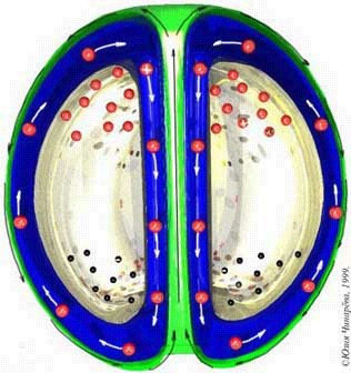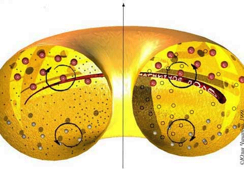 Рис. 1. Для уяснения дрейфовых движений представим себе плазменный тороид лежащим горизонтально. Рассечем его вертикальной плоскостью пополам. Допустим, мы увидели в правом сечении тороида магнитное поле, направленное от нас, то в левом сечении оно направлено к нам. Поперечная неоднородность поля, то есть сгущение силовых линий, наблюдается вокруг центрального отверстия, а разрежение – у наружной стороны тороида. Продольная неоднородность заключается в искривлении силовых линий поля, обращенных выпуклостью от центра тороида к наружной стороне. Поперечная неоднородность приводит к тому, что радиус кружка спирали ионизованной частицы в области сгущенного поля меньше, чем в области разреженного. Поэтому кружок с частицей будет выталкиваться поперек поля с силой, пропорциональной градиенту магнитного поля. Эта сила вызывает градиентный дрейф, в результате которого протонные спирали перемещаются вверх тороида, а электронные спирали – вниз. При движении ионизованной частицы по спирали вдоль искривленной силовой линии поля, обращенной выпуклостью к наружной стороне тороида, частица испытывает на себе центробежную силу к наружной стороне тороида. Эта сила увеличивает (растягивает) радиус вращения частицы за чертой выпуклости силовой линии поля и уменьшает (укорачивает) радиус вращения до черты выпуклости силовой линии поля. В результате протонные спирали дрейфуют вверх, а электронные – вниз тороида. Таким образом, и градиентный, и центробежный дрейфы ионизованных частиц вызывают в плазменном тороиде одинаковые разделения зарядов, приводящие к тому, что некоторая часть протонных спиралей оказывается на верхней половине тороида, а часть электронных спиралей – на нижней его половине. Такое заметное разделение зарядов приводит к образованию сильного электрического поля. В этом случае плазменный тороид можно рассматривать как заряженный конденсатор. Образовавшийся плазменный тороид, отделившись от линейной молнии, остается с той энергией, которую ему сообщила линейная молния. Некоторое время 10...20 секунд движение ионизованных частиц происходит по ларморовским спиралям вдоль захваченного магнитного поля линейной молнии, пока оно, сокращаясь к центру, не просочится наружу. Сразу же после отделения от линейной молнии плазменный тороид быстро сжимается. Собственные магнитные поля, обладая упругостью, отграничивают плазму от внешней среды, сжимая тороид, уменьшают его размеры пока не наступит равновесие с противодавлением изнутри со стороны плазмы. С повышением в плазме давления в ней повышается температура, то есть ускоряется движение плазмы, что означает продление жизни тороида. Отверстие в центре тороида, сокращаясь, становится незаметным, а тороид похожим на овал. Коллективные движения ионизованных частиц стабилизируют плазму тем, что их пути по большей части разделены. Электроны реже встречаются с ионами, от чего рекомбинация плазмы замедляется. Плазма может находится в равновесии без стенок, если ее газовое давление уравновешивается давлением внешнего магнитного поля [2, стр. 56]. У образовавшейся шаровой молнии – поле не внешнее (не постороннее). У нее собственные магнитные поля, благодаря которым плазменный тороид, сжатый в овал, наделен на границе плазма-атмосфера поверхностным натяжением и не смешивае
