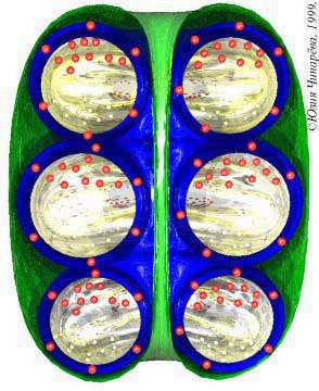 Рис. 2. Наблюдатели сообщают, что иногда из ярко светящегося клубка, возникающего на нижнем конце разряда линейной молнии, выскакивают несколько шаровых молний. Наблюдают шаровые молнии, которые разделяются на несколько мелких молний. Наблюдались шаровые молнии, из которых даже при взрыве выскакивали молнии меньшего размера. Думается, что предлагаемая идея может объяснить такие явления. При разряде линейной молнии в магнитное поле с холодной плазмой, охватывающей ее торец, влетают несколько пространственно разделенных порций горячей плазмы. Каждая отдельная порция горячих ионов и электронов образуют там с уже имеющимися ионными и электронными спиралями свою обособленную от других подогретую спиральную трубу, замкнутую в тороид. В результате внутри каждой подогретой тороидальной трубы в магнитном поле движутся по своим спиральным дорожкам электроны и протоны и те, что были там и те, что влетели в холодную плазму вместе с порцией горячей плазмы. Двигаясь в неоднородном магнитном поле внутри ионной трубы, протоны и электроны частично разделяются, образуя электрическое поле. Если образовавшиеся автономные тороиды не успели объединиться, сцепившись собственными поперечными магнитными полями, то они выталкиваются в атмосферу по отдельности, а если успели объединиться, то выталкивается одна большая шаровая молния в виде удлиненного овала. В [4, стр. 120] говорится: «М.Т. Дмитриев отмечает, что шаровая молния (точнее, центральная ее часть, окруженная ореолом) представляла собой вытянутый вдоль вертикального диаметра шар». Далее говорится: «Ряд других наблюдателей сообщают о вытягивании молний вдоль вертикального диаметра, изредка довольно значительном, в большинстве же случаев – небольшом». Таким образом, шаровая молния может включать в себя несколько автономных молний. Автономные тороиды молний нанизаны на одну общую ось, проходящую через центральные отверстия тороидов. Каждый тороид охвачен локально собственным продольным магнитным полем, а собственные поперечные магнитные поля тороидов, складываясь, образуют одно общее поперечное магнитное поле, охватывающее все автономные тороиды и замыкающееся через общее центральное отверстие шаровой молнии. При возникновении неустойчивости объединенная молния может разделиться, иногда с взрывом, то есть взрывается одна из них, а некоторые при взрыве могут и уцелеть.