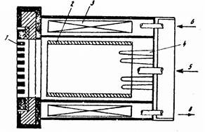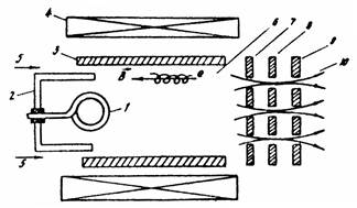 1 - термокатод, 2 - экран катода,3 - цилиндрический анод, 4 - соленоид, 5 - ввод рабочего газа,6 - плазма,7 - эмиссионный электрод, 8 - ускоряющий электрод, 9 - замедляющий электрод, 10 - ионный пучен Рис.1 Следует отметить ряд достоинств, определяющих применение многопучкового источника в ионной технологии. I. Низкое напряжение разряда (~20 В) уменьшает возможность распыления стенок камеры. Ионный пучок содержит небольшое количество примесей (10-6 %) и имеет малый энергетический разброс. 2. Механизм поддержания стационарного разряда допускает большой диаметр камеры при однородном распределении в ней плазмы, что, в свою очередь, позволяет применять многолучевое извлечение ионного пучка и работать с однородными потоками большого диаметра. 3. Осцилляция электронов позволяет использовать низкое давление в разрядной камере и поддерживать таким образом хороший вакуум в рабочей камере технологической установки, что снижает потери пучка и уменьшает загрязнение мишени. 4. Источник имеет высокий газовый к.п.д. (80 %) и высокий энергетический к.п.д. К числу недостатков конструкции МИИ можно отнести то обстоятельство, что использование термокатода ограничивает срок службы источника и не позволяет работать с химически активными рабочими веществами. Кроме того, плазма в магнитном поле подвержена неустойчивостям, ухудшающим стабильность параметров ионного пучка и его оптические свойства /4/. Типичные параметры технологического МИИ Ток ионов (Аr+), мА ....................10 Напряжение разряда, В .................. 20 Напряжение на ускоряющем электроде кВ... 20 Катодный узел технологического МИИ должен удовлетворять следующим требованиям: обеспечивать стабильные параметры газоразрядной плазмы с достаточно высокой концентрацией и температурой электронов; иметь ресурс не менее 100 ч; допускать быструю замену катода. Величина катодного тока зависит от диаметра анодной камеры и, соответственно, от поперечных размеров ионного потока. Например, при формировании ионного пучка с диаметром 25 см катодный ток в 10 раз больше, чем для потока с диаметром 7,5 см. Активность использования эмитированных электронов зависит от конфигурации нити накала и размещения катодного узла в разрядной камере. Более равномерное распределение концентрации заряженных частиц и, следовательно, более однородные ионные потоки могут быть получены в источнике с несколькими идентичными нитями накала, размещенными около стенок анодного цилиндра. В большинстве МИИ используется прямонакальный катод, хотя может применяться также и катод с косвенным накалом. Термокатод изготавливается из вольфрамовой или танталовой проволоки (ленты). Для улучшения эмиссионных характеристик катод может покрываться слоем щелочноземельных элементов, однако это приводит к распылению катодного покрытия и загрязнению ионного потока нежелательными примесями. Магнитная система с дивергенцией поля обеспечивает повышенную концентрацию и однородность плазмы в зоне экстракции и способствует уменьшению потерь в разряде. Таким образом удается сформировать равномерный по сечению ионный поток достаточно большого диаметра. Магнитные системы такого типа используются в установках Microetch фирмы Veeco(CШA). Мультипольные системы на постоянных магнитах, в зоне полюсных наконечников которых размещаются аноды, позволяют получить пучки больш