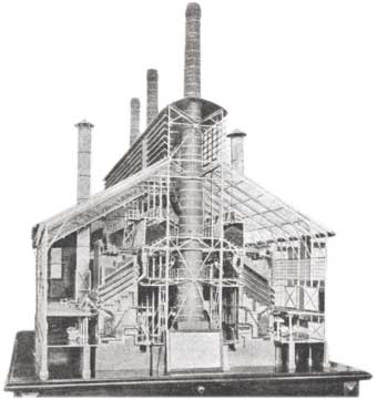 Рис. 1. Модель газового завода в Мюнхенском музее. Сегодня редкий человек знает о заводах, производивших светильный газ (рис.1). Газ получали при нагревании каменного угля в ретортах. Реторты – это большие металлические или глиняные полые сосуды, которые наполняли углем и нагревали в печи. Выделившийся газ очищали и собирали в сооружениях для хранения светильного газа – газгольдерах. Более ста лет назад, в 1838 году, «Общество освещения газом Санкт-Петербурга» построило первый газовый завод. К концу XIX века почти во всех крупных городах России появились газгольдеры. Газом освещали улицы, железнодорожные станции, предприятия, театры и жилые дома. В Киеве инженером А.Е.Струве газовое освещение было устроено в 1872году. Создание электрогенераторов постоянного тока с приводом от паровой машины позволило широко использовать возможности электричества. В первую очередь изобретатели позаботились об источниках света и обратили внимание на свойства электрической дуги, которую впервые наблюдал Василий Владимирович Петров в 1802 году. Ослепительно яркий свет позволял надеяться, что люди смогут отказаться от свечей, лучины, керосиновой лампы и даже газовых фонарей. В дуговых светильниках приходилось постоянно пододвигать поставленные «носами» друг к другу электроды – они достаточно быстро выгорали. Сначала их сдвигали вручную, затем появились десятки регуляторов, самым простым из которых был регулятор Аршро. Светильник состоял из неподвижного положительного электрода, закрепленного на кронштейне, и подвижного отрицательного, соединенного с регулятором. Регулятор состоял из катушки и блока с грузом. При включении светильника через катушку протекал ток, сердечник втягивался в катушку и отводил отрицательный электрод от положительного. Дуга поджигалась автоматически. При уменьшении тока втягивающее усилие катушки уменьшалось и отрицательный электрод поднимался под действием груза. Широкого распространения эта и другие системы не получили из-за низкой надежности. В 1875 году Павел Николаевич Яблочков предложил надежное и простое решение. Он расположил угольные электроды параллельно, разделив их изолирующим слоем. Изобретение имело колоссальный успех, и «свеча Яблочкова» или «Русский свет» нашел широкое распространение в Европе. Кто придумал лампочку? Изобретателем электрической лампочки накаливания считают русского электротехника А.Н.Лодыгина. В 1872 году он продемонстрировал образец лампы накаливания с угольной нитью и получил привилегию (патент) №1847. В то же время, другой изобретатель электрической лампочки, по другую сторону Атлантики, впервые задумался об использовании электрического освещения, когда газовая компания отключила газ в его мастерской за неуплату [2]. Его имя – Томас Алва Эдисон. На Всемирной выставке в 1881г. он представил разработанную им систему освещения. Позднее его современник Эмиль Ратенау* так описал свои впечатления: «По тогдашним понятиям гигантский генератор тока, названный «Джумбо», по своей конструкции и мощности намного уступал современным колоссам. Однако впервые были созданы машины, которые могли претендовать на это название. В центре новой системы находился шедевр – лампа накаливания с угольной нитью. Система освещения Эдисона была настолько продумана до мельчайших деталей и мастерски в