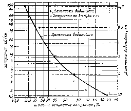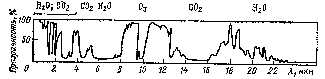Рис. 8. Молекулярное поглощение в оптической области спектра. d2 характеризует потери, обусловленные рассеянием на молекулах, частицах дыма и пыли, испарениях, тумане, дожде и снеге.d3 обуславливает сильно флуктуирующие во времени потери при передаче сигнала, что может привести к ограниченному во времени срыву передачи. Соответствующие потери можно уменьшить путем определенного выбора оптической системы, в частности с помощью расширения светового пучка. Для определения суммарных потерь на затухание для выбранной линии передач необходимы обширные измерения в течение больших промежутков времени при самых разнообразных атмосферных условиях при использовании источников света различных длин волн (рис. 9)