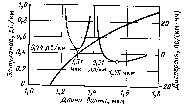 Рис. 11. Спектральная характеристика затухания кварцевого волокна, слабо легированного Ge. Вследствие высокой несущей частоты светового пучка можно использовать для модуляции практически очень высокие частоты. Используемую для передачи информации полосу частот называют шириной полосы частот сигнала, она может достигать несколько гигагерц. Тем самым возможна одновременная передача очень большого объема информации.Для достижения хороших характеристик передачи оптического волновода существенными являются: