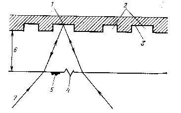 Рис. 2. Сечение видеодиска и грампластинки с лазерной записью: 1 - фокальное пятно (Ж » 1 мкм); 2 - структура микроуглублений; 3 - зеркальное покрытие; 4 - царапина; 5 - частица пыли; 6 - прозрачный защитный слой; 7 - луч от лазера При изготовлении видеодисков нанесенный прежде на подложку из стекла фотолак экспонируется с помощью специальной оптической системы излучением коротковолнового лазера (криптоновый лазер, l=0,35 мкм). После этого следует многоступенчатый процесс проявления, в результате которого образуется образцовый диск, который используется затем для изготовления других дисков путем оттиска. На полученные после отделения от образцового диска оттиски наносится зеркальное покрытие и слой лака, так что полученные при записи микроуглубления не могут быть закрыты частицами пыли. Пыль и царапины на защитном слое не мешают, поскольку они находятся вне плоскости фокусировки считывающей оптики (рис.2 ).При считывании микроскопических маленьких структур используются эффекты дифракции и интерференции света. Оптическая считывающая система для видеодисков состоит из: