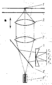 Рис. 4. Схема оптической считывающей головки для лазерных пластинок: 1 - считывающее пятно; 2 - считывающий объектив; 3 - оптическая система для преобразования излучаемого полупроводниковым лазером волнового поля в плоское волновое поле; 4 - призма; 5 - полупрозрачное зеркало; 6 - полупроводниковый лазер; F1 - F4 - фотоприемники. Применяемые лазеры:
