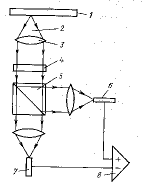 Рис. 6. Схема получения сигнала с помощью поляризационного эффекта Керра: 1 - магнитный диск; 2 - отраженный свет; 3 - микрообъектив; 4 - фазовая пластинка; 5 - делитель пучка; 6 - приемник Nr2; 7 - приемник Nr1; 8 - дифференциальный усилитель. Магнитооптическая запись позволяет в настоящее время иметь:
