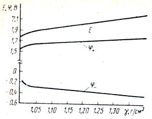 Основным параметром, характеризующим аккумуляторную батарею, является ее электродвижущая сила Е. ЭДС батареи состоящей из последовательно соединенных аккумуляторов, определяется сложением ЭДС каждого аккумулятора. ЭДС свинцового аккумулятора зависит только от химических и физических свойств веществ, участвующих в электродных процессах, и совершенно не зависит от размеров электрода и количества активных материалов. ЭДС одного аккумулятора определяется как разность равновесных потенциалов положительного и отрицательного электродов: Потенциалом электрода j называется разность потенциалов между данным электродом и условным электродом сравнения. Активность электролита зависит от его концентрации, то есть от плотности. Поскольку электролит принимая участие в электрохимических реакциях изменяет свою плотность, изменяются потенциалы электродов j и соответственно ЭДС аккумулятора. График зависимости ЭДС и потенциалов электродов от плотности электролита: