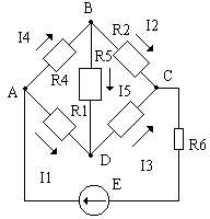 рис 7. Задание 3. Для схемы электрической цепи ( рис 7. ) определить количество узлов , показать токи в ветвях и составить уравнения по первому и второму законам Кирхгофа. |