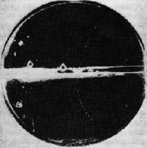 На этой фотографии виден след частицы с импульсом 29 Мэв/с, ионизация которой примерно в шесть раз превышает минимальную. Эта частица обладает отрицательным зарядом, поскольку она движется вниз. Судя по импульсу и удельной ионизации, ее масса оказывается равной примерно 175 массам электрона; вероятная ошибка, составляющая 25 %, обусловлена неточностью измерения удельной ионизации. Заметим, что электрон, обладающий импульсом 29 Мэв/с, имеет практически минимальную ионизацию. С другой стороны, частицы с таким импульсом и массой протона (либо движущийся вверх обычный протон, либо отрицательный протон, движущийся вниз) обладают удельной ионизацией, которая примерно в 200 раз превышает минимальную; кроме того, пробег такого протона в газе камеры должен быть меньше 1 см. В то же время след, о котором идет речь, ясно виден на протяжении 7 см, после чего он выходит из освещенного объема. Описанные выше эксперименты безусловно доказали, что проникающие частицы действительно являются более тяжелыми, чем электроны, но более легкими, чем протоны. Кроме того, эксперимент Стрита и Стивенсона дал первую примерную оценку массы этой новой частицы, которую мы можем теперь назвать ее общепринятым именем - мезон.
