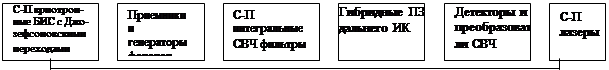 Проблема создания структур на основе контактов С—П, приборов и многофункциональных устройств на этих структурах является комплексной. Нужно пройти большой путь от разработки воспроизводимой технологии получения простейших контактов и приборов, например полупроводникового (как это ни странно звучит) криотрона с джозефсоновским вентилем, сверхчувствительных детекторов дальнего ИК диапазона до криоэлектронных приемных устройств и вычислительных систем, в которых необходимо будет найти разумное сочетание различных рассматриваемых структур. Но в целом этот путь полезный и даёт много нового микроэлектронике. Это можно показать в виде условной схемы на рисунке № 1, в которой представлены не только структуры и приборы, о которых выше упоминалось, но и возможные перспективные приборы.[9] Применение рассмотренных структур на основе контактов сверхпроводников с полупроводниками в криоэлектронике открывает новые возможности для создания различных (функциональных приборов: усилителей, детекторов, преобразователей, ПЗС с внутренним усилением, приемников ИК диапазона, линий задержки, регистров сдвига. Сочетание на одном полупроводниковом кристалле нескольких структур, выполненных в одном технологическом цикле, например структур, имеющих параметрические и детекторные элементы, в принципе позволяет поднять чувствительность криоэлектронных приемников прямого усиления до уровня супергетеродинных. Сочетание сверхпроводящих структур с полупроводниковым барьером, в которых при проявлении эффекта Джозефсона частоты принимаемого сигнала могут охватить практически весь ИК диапазон, с регистром сдвига на структурах с зарядовой связью и малошумящими усилительными элементами позволяет создать многоэлементные приемники с самосканированием, работающие в дальнем и сверхдальнем ИК диапазонах. Возможно создание на этой основе и многодиапазонных ПЗС ИК диапазона. При построении сложных интегральных схем на СВЧ микрополосковые линии и резонаторы усилителей могут быть выполнены непосредственно на той части поверхности полупроводникового кристалла, в которой при температурах Т<Тс наступает «вымораживание» носителей заряда и потери становятся примерно такими же, как и в хороших диэлектриках. На эту часть кристалла может быть нанесено и несколько дополнительных связанных пленочных сверхпроводящих резонаторов, образующих сверхпроводниковые СВЧ фильтры, либо преселекторы — усилители со сверхпроводниковыми резонаторами, предложенные и рассмотренные для мазера с пассивными сверхпроводниковыми резонаторами, либо Сп болометры. Способность работать при любых условиях охлаждения, вплоть до температур, близких к абсолютному нулю, где отсутствуют тепловые колебания, а шумы кристаллической решетки становятся исключительно малыми, причем ассортимент сверхпроводниковых и полупроводниковых материалов существенно расширен, является одним из ценных свойств рассматриваемых структур, которые базируются на передовой технологии БИС. Тенденция к освоению в микроэлектронике свойств твердого тела при криогенных температурах, проявившаяся благодаря успехам в создании различных криоэлектронных приемных систем на базе сверхпроводников, узкозонных полупроводников и других материалов, неуклонно пробивает себе дорогу. Однов