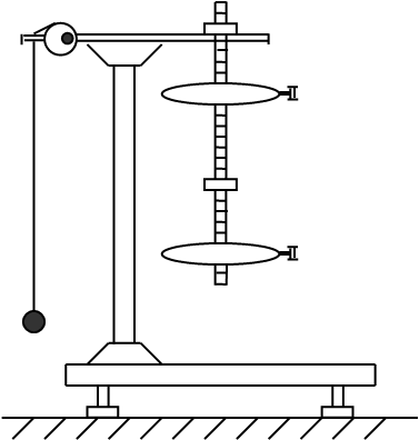Рис.5 2. Экспериментальная часть 2.1. Описание установки Комбинированная лабораторная установка позволяет проводить исследование свободных колебаний двух типов маятников: математического и физического. В качестве физического маятника применяется маятник Кэтера. Установка (рис.6) состоит из горизонтальной подставки 2, на которой закреплена вертикальная стойка 5. На верхнем торце стойки жестко закреплен горизонтальный кронштейн 8. Четыре ножки винта 1 позволяют устанавливать подставку в горизонтальном положении. С одной стороны кронштейна находится барабан 11, который может вращаться с небольшим усилием с помощью ручки 10. Тонкая нить, немотанная еа барабан , пропущена через неболльшое отверстие в кронштейне. На конце нити закреплен стальной шарик 3 небольшого радиуса . Шарик , подвешанный на нити , можно рассмстривать как математический маятник , совершающий колебания в вертикальной плоскости . Длину нити, а тем самым и длину маятника, можно менять, вращая барабанчик. 11