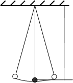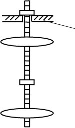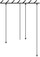 Рис.6 С противоположной стороны кронштейна в специальном гнезде подвешан оборотный маятник . Он состоит из тонкого стального стержня 9, по которому можно перемещать две массивные чечевицы 4 и две легкие опорные призмы 6. Опорные призмы и чечевицы фиксируются на стержне с помощью винтов. Правильное взаимное расположение опорных призм и чечевиц на стержне приведено на рисунке 6. Нанесенные на стержень деления(цена деления – 1,0см) позволяют определять положения призмы и чечевиц на стержне. Маятник может совершать колебания в вертикальной плоскости. Колебания как математического, так и оборотного маятников будут гармоническими, если амплитуда колебаний не будет превышать нескольких градусов (4 – 6) 2.2. Определение ускорения силы тяжести с помощью математического маятника 2.2.1. Вывод рабочей формулы Длина маятника равна расстоянию от точки подвеса до центра тяжести шарика ,поэтому непосредственно измерить длину маятника достаточно сложно. Как видно из рис.7 длина маятника l = l0 + r, где r –радиус шарика. При измерении ускорения силы тяжести поступают следующим образом: измеряют с помощью линейки расстояние h от основания подставки до шарика и диаметр шарика 2r. Длина маятника, как видно из рисунка, l = H-h-r. Затем определяют периоды свободных колебаний T1 и T2 маятников двух различных длин: l’ и l”. Из формулы (17) имеем