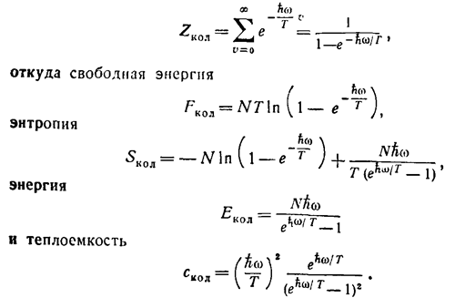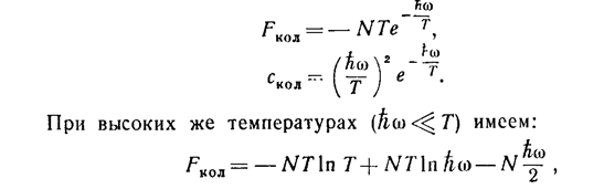 (29) Появление здесь постоянного члена — 1/2Nћω связано с тем, что, мы отсчитываем энергию от низшего квантового уровня (т. е. от энергии «нулевых колебаний»), между тем как классическая энергия должна была бы отсчитываться от минимума потенциальной энергии. Выражение (26) для свободной энергии можно, конечно, получить и классическим путем, поскольку при T>>ћω существенны большие квантовые числа V, для которых движение квазиклассично. Классическая энергия малых колебаний с частотой ω имеет вид