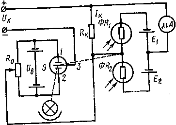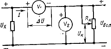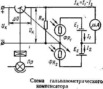 Рис. 7.7. Схема измерения постоянного напряжения дифференциальным методом измеряемым и образцовым напряжением при их неполной компенсации. Схема измерения представлена на рис. 7.7. Высокоомный электронный вольтметр у! с чувствительным пределом служит для измерения разностного напряжения между измеряемым Ux и образцовым UK напряжениями. Магнитоэлектрический аналоговый или цифровой вольтметр У2 используется для измерения образцового напряжения 1/к. Рекомендуется при UK — 0 измерить вольтметром V1 ориентировочное значение Ux, а уже затем установить по вольтметру V2 удобное для отсчета напряжение UK. Измеряемое напряжение Ux при указанной полярности включения вольтметра V1 определяется как Ux=UK +∆U Дифференциальный метод обеспечивает высокую точность измерения напряжения. Погрешность измерения определяется в основном погрешностью вольтметра, измеряющего L/K. Входное сопротивление цепи RВХ=UX/I=(UK+∆U)/(∆U/RV1)=RV1(UK/∆U+1) (7.7) намного превышает входное сопротивление rvi вольтметра Vt. Гальванометрические компенсаторы служат для измерения малых постоянных напряжений (порядка 10~8 В). Основными элементами гальванометрического компенсатора (рис. 7.8) являются: измерительный механизм магнитоэлектрического зеркального гальванометра G, образцовый резистор обратной связи Rк, фоторезисторы ФR1 и ФR2, источники постоянного напряжения с Е1 = Е2, магнитоэлектрический микроамперметр. На зеркальце гальванометра G направлен луч света от прожектора Пр. При отсутствии напряжения Vх луч света, отраженный от зеркала, одинаково освещает фотосопротивления, в результате ток Iк = 0. При подаче на вход измерителя напряжения Ux в цепи гальванометра G появляется ток Iг, подвижная часть гальванометра поворачивается на некоторый угол и происходит перераспределение освещенности фоторезисторов и изменение их сопротивлений.