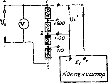 Рис. 7,9, Схема электрометрического компенсатора К подвижной обкладке прикреплено миниатюрное зеркальце. На неподвижные обкладки подается напряжение возбуждения UВ, что позволяет повысить чувствительность и возможность установки нуля показаний электрическим путем (при замкнутых зажимах Ux посредством переменного резистора R0). Принцип работы электрометрического компенсатора аналогичен работе гальванометрического компенсатора. При подключении измеряемого напряжения Ux подвижная часть электрометра Э повернется на некоторый угол, что приведет к перераспределению световых потоков, освещающих фоторезисторы ФRl и ФR2 к появлению тока компенсации Iк и соответственно напряжения UК, уравновешивающего измеряемое напряжение Ux. Подвижная часть электрометра будет отклоняться до тех пор, пока не наступит равенство напряжений Ux = UK. Так как сопротивление резистора обратной связи RK может быть незначительным, то ток Iк может быть сравнительно большим и измеряться микроамперметром. Входной ток компенсатора определяется токами утечки, поэтому он мал, а следовательно, входное сопротивление велико (1016 — 1017 Ом). Кроме измерителей напряжения строятся и высокочувствительные электрометрические измерители тока. ПРИМЕНЕНИЕ КОМПЕНСАТОРОВ ПОСТОЯННОГО ТОКА Компенсаторы, как было указано, способны измерять напряжение или э. д. с.; косвенным образом с их помощью можно измерять и ряд других электрических величин, таких, как ток, сопротивление, мощность, связанных с напряжением определенной зависимостью. Как приборы высокой точности, компенсаторы используются в измерительной технике в основном, для поверки измерительных приборов непосредственной оценки — амперметров, вольтметров, ваттметров. Целью поверки является нахождение основной погрешности прибора и установление степени его соответствия классу точности, указанному на шкале этого прибора. Кроме того, во многих случаях при лабораторных исследованиях, технических и промышленных измерениях также пользуются компенсационными схемами (либо для достижения высокой точности измерений, либо для выполнения измерения без отбора тока от объекта измерения). Ниже приведены схемы измерения основных электрических величин. Схема для измерения напряжения и э. д. с. Измеряемое напряжение Ux подводится к зажимам I—3, делителя напряжения (рис. VI-26). Поскольку величина Ux может меняться в больших пределах, достигая сотен и даже тысяч вольт, а компенсатор непосредственно способен измерять напряжение порядка (1ч2) в, между компенсатором и измеряемым напряжением включают делитель напряжения. На рисунке приведена схема делителя напряжения типа ДН-1, выпускаемого специально для компенсаторов. Измеряемое напряжение, на которое включен поверяемый вольтметр, целиком подводят к делителю напряжения, а к компенсатору—только часть этого напряжения. Напряжения; подводимое к делителю, Ux, и снимаемое с делителя к компенсатору, Ux , связаны между собой зависимостью: