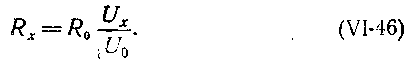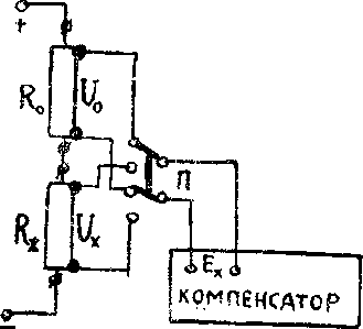 . Образцовые сопротивления, представляют собой сопротивления высокого класса точности и всегда имеют номинальные значения вида 1-10", где п— целое число. Как правило, они имеют четыре зажима: два токовых и два потенциальных. Токовыми зажимами образцовое сопротивление включается в токовую цепь, а с потенциальных снимается напряжение к компенсатору. Для увеличения точности измерения rq выбирают таким, чтобы падение напряжения на нем от измеряемого тока было не менее 10% значения верхнего предела измерения данного компенсатора; при этом будут использованы все декады магазина R компенсатора. Схема для измерения сопротивлений Измеряемое сопротивление Rx включается чаще всего последовательно с образцовым сопротивлением R0. Падения напряжений, создаваемые на этих сопротивлениях, Uх и UQ, измеряются компенсатором (рис. VI-28).