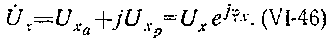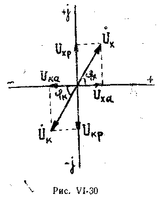 С помощью переключателя П компенсатор присоединяется попеременно то в цепь напряжения ваттметра, то в цепь его тока. Вначале, при положении 1 переключателя П, с помощью компенсатора устанавливается номинальное 'напряжение ваттметра, которое в дальнейшем поддерживается постоянным и периодически проверяется опять-таки на компенсаторе. Затем переключатель Я ставят в положение 2 и, регулируя реостатом /?рег ток в последовательной цепи ваттметра, устанавливают стрелку прибора на оцифрованных отметках шкалы, измеряя силу тока. Для каждой отметки определяется значение мощности как произведение тока ,на напряжение, и результат расчета сверяется с показанием прибора. Разность между показанием прибора и результатом измерения мощности на компенсаторе даст основную погрешность ваттметра для каждого поверенного деления шкалы. КОМПЕНСАТОРЫ ПЕРЕМЕННОГО ТОКА Компенсаторы переменного тока — это приборы, измеряющие на переменном токе напряжения и некоторые другие электрические величины, связанные с напряжением функциональной зависимостью (ток, сопротивление, мощность и др.). Как известно, напряжение на переменном токе можно представить как комплексную величину и изобразить в виде вектора, занимающего определенное положение на комплексной плоскости (рис. VI-30),