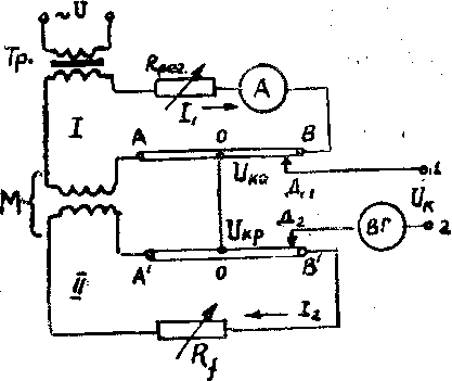 Компенсационный метод измерения на переменном токе, так же как и на постоянном, заключается в уравновешивании неизвестного напряжения известным. Для того, чтобы скомпенсировать на переменном токе напряжение. Ux, необходимо и достаточно приложить к нему другое напряжение Uк, равное по амплитуде, форме кривой и частоте, но сдвинутое по фазе относительно Ur на 180°.