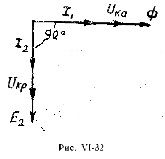 Рис. VI-31 Компенсатор состоит из двух контуров: / и //. Напряжение источника питания схемы U, связанное с первым контуром через трансформатор, вызывает в этом контуре ток I1, величину которого можно регулировать реостатом Rрег и измерять амперметром. Проходя по реохорду А—В, представляющему собой чисто активное сопротивление, ток 1\ создает на нем падение напряжения UKA совпадающее по фазе с током. Контур 1 связан с контуром 2 через воздушный трансформатор М (катушку взаимной индуктивности без стального сердечника). При протекании тока I1 через первичную обмотку катушки М в ней возникает магнитный поток ф, находящийся в фазе с током I1 который вызовет появление во .вторичной обмотке э д. с Е2 отстающей от потока ф на 90°. Если пренебречь индуктивным сопротивлением вторичной обмотки воздушного трансформатора, то можно считать, что ток второго контура I2 совладает по фазе с э. д. с. Е2, а напряжение Uкр на реохорде А—В, представляющем собой чисто активное сопротивление, совпадает по фазе с током I2. Таким образом, в схеме создаются условия, при которых токи I1 и I2, а также напряжения, снимаемые с реохордов А—В и А'—В', сдвинуты на угол 90° одно по отношению к другому. Векторная диаграмма компенсатора приведена на рис. VI-32. Как видно из рис. VI-31, середины реохордов А—В и А'—В' электрически соединены, образуя нулевую точку схемы. Измеряемое напряжение UX=UXA+jUxp подводится к зажимам /—2 и далее, через вибрационный гальванометр, к движкам Д и Д2. Компенсирующее напряжение UX=UKA+ fUKp, равное геометрической сумме напряжений Uha и UKp, возникающих па реохордах, снимается с движков Д\ и Д2. Напряжение UKa. которое создается на реохорде первого контура, называют активной составляющей компенсирующего напряжения, а напряжение UKP на реохорде второго контура -- его реактивной составляющей.