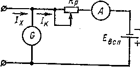 Рис. 7.3. Схема компенсации токов Схема, показанная на рис. 7.2, наиболее распространенная. В ней измеряемое напряжение Ux компенсируется равным, но противоположным по знаку известным напряжением UK. Падение напряжения UK создается током / на изменяемом по значению компенсирующем образцовом сопротивлении RK. Изменение Rк происходит до тех пор, пока UK не будет равно Ux. Момент компенсации определяют по отсутствию тока в цепи магнитоэлектрического гальванометра G; при этом мощность от объекта измерения не потребляется. Компенсационный метод обеспечивает высокую точность измерения. Компенсаторами или потенциометрами называют устройства, предназначенные для измерения методом компенсации напряжения или э.д.с., а также ряда других электрических величин, связанных с напряжением или э.д.с. с функциональной зависимостью (например, I, P, R, и др.). В практических схемах компенсаторов для обеспечения необходимой точности измерения ток I в рабочей цепи определяют не амперметром непосредственной оценки, а компенсационным методом с помощью эталона ЭДС нормального элемента. Нормальные элементы обеспечивают постоянную во времени ЭДС, равную 1,01865 В при температуре 20 °С, внутреннее сопротивление 500—1000 Ом, ток перегрузки 1 мкА. С изменением температуры окружающей среды значение ЭДС уменьшается на каждый градус повышения температуры: Et = E20 - 0,00004 (t - 20) - 0,000001 (t ~ 20)2, (7.3) где E t — ЭДС при температуре t, °С; E20 — ЭДС при 20 °С. Схема компенсатора представлена на рис. 7.4. Она содержит источник вспомогательной ЭДС Eвсп для питания рабочей цепи, в которую включают регулировочное Rp, компенсирующее RK и образцовое RH сопротивления. К зажимам НЭ подключают нормальный элемент, ЭДС которого Eнэ, к зажимам X — искомую ЭДС Ех. В качестве индикатора равновесия используют высокочувствительный магнитоэлектрический гальванометр G. При работе с Компенсатором выполняют две операции: 1) устанавливают ток / в рабочей цепи компенсатора с помощью источника вспомогательной ЭДС Eвсп (положение 1 переключателя В); 2) измеряют искомую ЭДС Ех (положение 2 переключателя В). Для установки рабочего тока предварительно определяют температуру окружающей среды, затем по (7.3) вычисляют точное значение ЭДС нормального элемента для данной температуры. Далее устанавливают образцовое сопротивление RH, значение которого выбирают в зависимости от значений тока в рабочей цепи и ЭДС при температуре t (сопротивление RK состоит из катушки с постоянным значением сопротивления и последовательно соединенной с ней температурной декадой). Затем переключатель В ставят в положение 1 и ЭДС