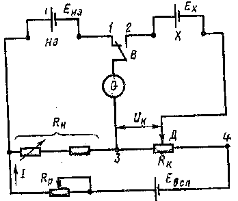 Рис. 7.4. Схема компенсатора нормального элемента противопоставляют падению напряжения на Ru, которое регулируется с помощью изменяющего значение тока / в рабочей цепи резистором Rp. Момент компенсации соответствует нулевому отклонению гальванометра G, т. е. Eнэ = IRn. После установления рабочего тока I для измерения Ех переключатель В ставят в положение 2 и регулировкой образцового компенсирующего сопротивления Rк вновь доводят до нуля ток в цепи гальванометра G. Тогда