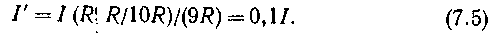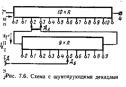 Рис. 7.5, Схема с замещающими декадами общее сопротивление между точками 3 и 4 (см. рис. 7.4) остается неизменным. Ток через ceкции сопротивлений нижней декады Г в десять раз меньше тока ' через секции сопротивлений верхней декады, т. е.