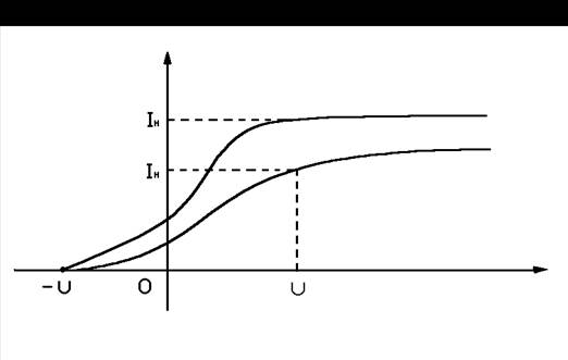Две такие характеристики представлены на (рис.3). Экспериментально установлены следующие закономерности и законы внешнего фотоэффекта. 1. При отсутствии напряжения между электродами фототок отличен от нуля. Это значит, что фотоэлектроны обладают при вылете кинетической энергией. 2. По мере увеличения U фототок I постепенно возрастает, т.к. всё большее число фотоэлектронов достигает анода. 3. При достижении между электродами некоторого ускоряющего напряжения Uн все электроны, выбиваемые из катода, достигают анода и сила фототока перестаёт зависеть от напряжения. Такой фототок, сила которого с увеличением напряжения не возрастает, называют фототоком насыщения. Если число фотоэлектронов, вылетающих из освещаемого металла в единицу времени, равно nе, то сила фототока насыщения Iн=Dq/Dt=Ne/Dt=ne