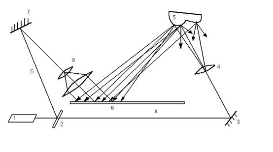 Типичная оптическая схема голографической установки приведена на (рис.4) Лазер 1 испускает монохроматический пучок света, который делится на два с помощью светоделительной пластинки 2, пучок А предметная волна - через систему зеркал 3 и 7 и линз 4 и 8 направляется на объект 5, отражается от него и попадает на фотопластинку 6, где интерферирует с опорной волной Б. Все элементы установки крепятся на одной жесткой поверхности, чтобы избежать даже весьма малых перемещений в процессе съемки голограммы. Метод голографической интерферометрии заключается в последовательной записи на одной фотопластинке двух голограмм от одного объекта, однако в промежутке между записями объект подвергается какому – либо воздействию (механическому деформированию, нагреванию и т.п.). В результате этого оптическая длина пути предметных волн, отражённых до и после воздействия, оказывается различной, возникают дополнительная разность хода и, соответственно, некоторый сдвиг фаз обеих волн. При считывании такой голограммы воспроизводятся обе предметные волны, которые интерферируют. Если деформация объекта невелика (соизмерима с длиной волны l ), то изображение объекта будет четким, но покрытым интерференционными полосами, ширина и форма которых количественно позволяют описать деформации объекта, так как вид полос в каждой точке поверхности пропорционален изменению оптической длины пути. Голографическая интерферометрия применяется так же для обнаружения дефектов в том случае, если они (трещины, пустоты, неоднородности свойств материала, и т.п.) приводит к аномальной деформации поверхности объекта при нагружении. Деформации обнаруживаются по изменению интерференционной картины по сравнению с картиной, возникающей без дефектного образца. При голографическом интерференционном неразрушающем контроле используют различные способы нагружения. Например, при механическом нагружении обнаруживаются и локализуются микротрещины длиной в несколько миллиметров, как на поверхности материала, так и в близи неё. Такие исследования проводятся, в частности, для обнаружения трещин в бетоне и наблюдении за их ростом. Голографическая интерферометрия используется для изучения качества соединения в полых конструкциях, тогда используется нагружение под давлением и вакуумное нагружение. Деформация в дефектных областях и, следовательно, интерференционные картины отличаются от деформации других участков конструкции. Часто применяется термическое нагружение. Этот метод основан на изучении поверхностных деформаций, возникающих при изменении температуры поверхности. В зоне дефекта искажается температурное поле, что приводит к локальному изменению деформации и, следовательно, к искажению интерференционной картины. Благодаря высокой чувствительности голографической интерферометрии, регистрируемые деформации появляются при изменении температуры объекта всего на несколько градусов по сравнению с температурой окружающей среды.