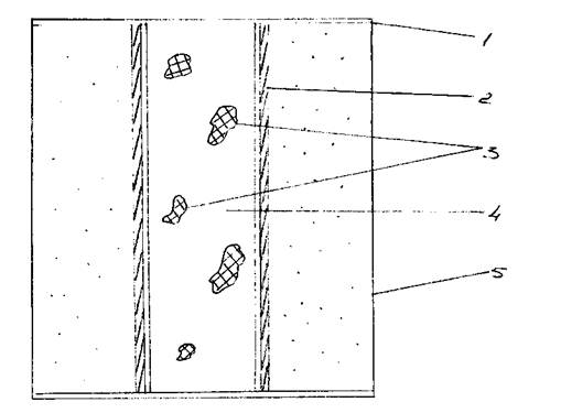 Схема блока, загружаемого в камеру высокого давления. 1- диск из тантала или титана; 2- нагревательная трубка; 3- куски «катализатора»; 4- гексагональный нитрид бора; 5- изолирующий пирофиллит.