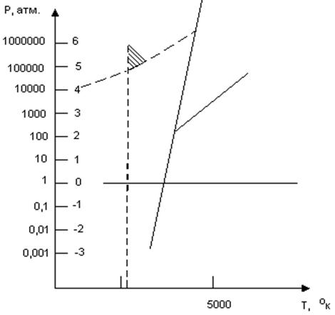 Рис 2. Фазовая диаграмма углерода. Фазовая диаграмма боразона сравнена с данной диаграммой. Оказалось, что в качестве ’’катализаторов’’ можно использовать также нитриды перечисленных выше металлов. Поскольку применение легких металлов имеет определенные преимущества, в качестве ’’катализаторов’’ использовали нитриды лития, магния, или кальция. Эти ’’катализаторы’’ позволяли получать кристаллы кубического нитрида бора при давлениях 44000-74000 атм. И температурах 1200-2000 ˚С. Общее количество боразона, образующего за один опыт, достигало 0,3 г., а размеры отдельных полиэдрических кристаллов доходили до 0,7 мм. Наиболее подробно исследована система нитрид бора – нитрид лития. Было установлено, что в этой системе проходит образование комплекса примерно состава Li3N·3BN. Этот комплекс действует как расплавленный растворитель, который растворяет гексагональный BN и заставляет выпадать кубический нитрид бора в силу смещения от термодинамического равновесия в область устойчивости кубической формы при рабочем давлении и температуре. По-видимому, процесс представляет собой перекристаллизацию нитрида бора из раствора Li3N·3BN действует как жидкий растворитель, и кристаллизация нитрида бора из раствора происходит при пересыщении последнего. Высокие давления и температуры обуславливают алмазоподобную структуру выпадающих из раствора кристаллов BN. Размер образующихся кристаллов боразона зависит прежде всего от тех давлений и температур, при которых проводится процесс. Чем ближе к пограничной линии между областями существовании кубической и гексагональной форм нитрида бора находятся эти параметры, там крупнее образуются кристаллы. Если процесс проходит у пограничной линии, то при более высоких температурах, то скорость реакции увеличивается; в следствии этого уже небольшие изменения давления или температуры оказывают сильное влияние на качество кристаллов. Поэтому наилучшие кристаллы были выращены при средних значениях давления и температуры (50000 и 1700 ˚С). Время образования кристаллов при таких условиях составляло всего лишь несколько минут. При повышении давления до 70000 атм. кристаллы уменьшились до 0,02 мм, что свидетельствовало о значимом увеличении скорости образования зародышей. Во вторую группу методов входят химические реакции, которые проводят при сверхвысоких давлениях. В качестве исходных материалов использовались смеси из бора и нитрида лития. При этом наблюдали образование кубического нитрида бора, однако выход процесса и качество кристаллов были хуже, чем при использовании гексагонального нитрида бора и нитрида –’’катализатора’’. Виккери описывает способ получения кубического нитрида бора при обычном давлении путем азотирования фосфида бора BP при температуре 800 ˚С. Фосфид бора, полученный путем термического соединения BCe3·PCe5, имел вид тонких темных пленок. При обработке этих пленок в токе смеси, состоящей из 5% аммиака им 95% азота, они свели, и происходило выделении фосфина. Рентгеноструктурный анализ полученного продукта показал, что он представляет кубический нитрид бора. В основе описанного процесса лежит реакция: BP+NH 3 → BN(куб.)+PH3 Учитывая данные Венторфа и кристаллохимическую близость кубического нитрида бора и алмаза, следует критически подойти к сообщению Виккери, тем более, что за годы, прошед