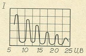 Вычисленная таким образом из опытных данных длина волны совпала по значению с дебройлевской длиной волны. Интересны результаты другого опыта, в котором пучок электронов направлялся на монокристалл, но расположение приемника и кристалла не изменялось. При изменении ускоряющего напряжения, т. е. скорости электронов, зависимость силы тока через гальванометр от ускоряющего напряжения имела вид, представленный на рисунке 3. Электронный пучок испытывал наиболее эффективное отражение при скоростях частиц, удовлетворяющих - условию дифракционного максимума. Последующие эксперименты полностью подтвердили правильность гипотезы де Бройля и возможность использования уравнения (6) для расчета длины волны, связанной с любым материальным объектом. Обнаружена дифракция не только элементарных частиц (электрон, протон, нейтрон), но и атомов. Выполнив расчеты длины дебройлевской волны для различных материальных объектов, можно понять, почему мы не замечаем в повседневной жизни волновых свойств окружающих нас тел. Их длины волн оказываются столь малыми, что проявление волновых свойств невозможно обнаружить. Так, для пули массой 10 г, движущейся со скоростью 660 м/с, длина дебройлевской волны равна: