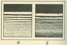 рис. 3 рис. 4 При этом условии дифракционная картина, получаемая от электронного пучка, становится подобной картине дифракции пучка рентгеновских лучей с такой же длиной волны. На рисунке 4 представлены фотографии дифракционных картин, наблюдающихся при прохождении пучка света (а) и пучка электронов (б) у края экрана. Гипотеза де Бройля и атом Бора. Гипотеза о волновой природе электрона позволила дать принципиально новое объяснение стационарным состояниям в атомах. Для того чтобы понять это объяснение, выполним сначала расчет длины дебройлевской волны электрона, движущегося по первой разрешенной круговой орбите в атоме водорода. Подставив в уравнение (6) выражение для скорости электрона на первой круговой орбите, получим: