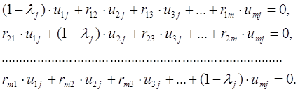 значений признаков, элементы матрицы вычисляют по формуле: Если предварительнаястандартизация данных не проводилась, то на данном шаге получают матрицу S = (1/n)*X’*X, элементы матрицы X для расчета будут центрированными величинами. Опишем дальнейшие шаги вычислений для метода главных компонент и объясним математический смысл полученных результатов. Λ – диагональная матрица собственных (характеристических) чисел. Множество решений λj находят решением характеристического уравнения |R - λE| = 0. λj – это характеристики вариации, точнее, показатели дисперсии каждой главной компоненты. Суммарное значение Σλj равно сумме дисперсий элементарных признаков Xj. При условии стандартизации исходных данных, эта сумма равна числу элементарных признаков m. Решив характеристическое уравнение, находят его корни λj. После этого вычисляют собственные векторы матрицы R. Реально это означает решение m систем линейных уравнений для каждого λj при j = 1..m. В общем виде система имеет вид: