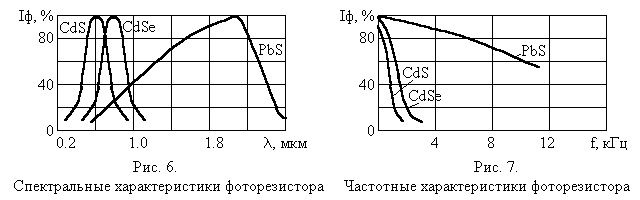 4.2 Характеристики фоторезисторов Основными характеристиками фоторезисторов являются: Вольтамперная, характеризующая зависимость фототока (при постоянном световом потоке Ф) или темнового тока от приложенного напряжения. Для фоторезисторов эта зависимость практически линейна (рис. 4 приложения). Закон Ома нарушается в большинстве случаев только при высоких напряжениях на фоторезисторе. Световая (люксамперная), характеризующая зависимость фототока от падающего светового потока постоянного спектрального состава. Полупроводниковые фотрезисторы имеют нелинейную люксамперную характеристику (рис. 5 приложения). Наибольшая чувствительность получается при малых освещенностях. Это позволяет использовать фоторезисторы для измерения очень малых интенсивностей излучения. При увеличении освещенности световой ток растет примерно пропорционально корню квадратному из освещенности. Наклон люксамперной характеристики зависит от приложенного к фоторезистору напряжения. Спектральная, характеризующая чувствительность фоторезистора при действии на него потока излучения постоянной мощности определенной длины волны. Спектральная характеристика определяется материалом, используемым для изготовления светочувствительного элемента. Сернисто-кадмиевые фоторезисторы имеют высокую чувствительность в видимой области спектра, селенисто-кадмиевые – в красной, а сернисто-свинцовые – в инфракрасной (рис. 6 приложения). Частотная, характеризующая чувствительность фоторезистора при действии на него светового потока, изменяющегося с определенной частотой. Наличие инерционности у фоторезисторов приводит к тому, что величина их фототока зависит от частоты модуляции падающего на них светового потока – с увеличением частоты светового потока фототок уменьшается (рис. 7 приложения). Инерционность оганичивает возможности применения фоторезисторов при работе с переменными световыми потоками высокой частоты.
