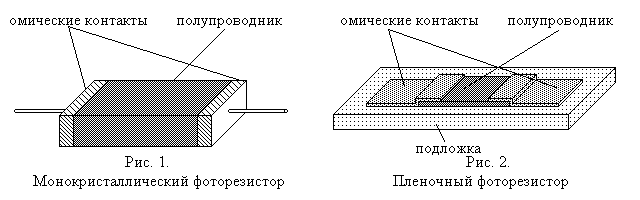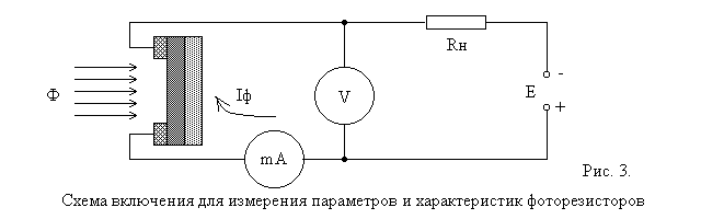 4.1Фоторезисторы Фоторезисторами называют полупроводниковые приборы, проводимость которых меняется под действием света. Конструкция монокристаллического и пленочного фоторезисторов показана на рис. 1, 2 приложения. Основным элементом фоторезистора является в первом случае монокристалл, а во втором – тонкая пленка полупроводникового материала. Если фоторезистор включен последовательно с источником напряжения (рис. 3 приложения) и не освещен, то в его цепи будет протекать темновой ток Iт = E / (Rт + Rн), (4) где Е – э. д. с. источника питания; Rт – величина электрического сопротивления фоторезистора в темноте, называемая темновым сопротивлением; Rн – сопротивление нагрузки. При освещении фоторезистора энергия фотонов расходуется на перевод электронов в зону проводимости. Количество свободных электронно-дырочных пар возрастает, сопротивление фоторезистора падает и через него течет световой ток Iс = E / (Rс + Rн). (5) Разность между световым и темновым током дает значение тока Iф, получившего название первичного фототока проводимости Iф = Iс – Iт. (6) Когда лучистый поток мал, первичный фототок проводимости практически безынерционен и изменяется прямо пропорционально величине лучистого потока, падающего на фоторезистор. По мере возрастания величины лучистого потока увеличивается число электронов проводимости. Двигаясь внутри вещества, электроны сталкиваются с атомами, ионизируют их и создают дополнительный поток электрических зарядов, получивший название вторичного фототока проводимости. Увеличение числа ионизированных атомов тормозит движение электронов проводимости. В результате этого изменения фототока запаздывают во времени относительно изменений светового потока, что определяет некоторую инерционность фоторезистора.