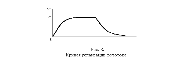 4.3Параметры фоторезисторов Основные параметры фоторезисторов: Рабочее напряжение Uр – постоянное напряжение, приложенное к фоторезистору, при котором обеспечиваются номинальные параметры при длительной его работе в заданных эксплуатационных условиях. Максимально допустимое напряжение фоторезистора Umax – максимальное значение постоянного напряжения, приложенного к фоторезистору, при котором отклонение его параметров от номинальных значений не превышает указанных пределов при длительной работе в заданных эксплуатационных условиях. Темновое сопротивление Rт – сопротивление фоторезистора в отсутствие падающего на него излучения в диапазоне его спектральной чувствительности. Световое сопротивление Rс – сопротивление фоторезистора, измеренное через определенный интервал времени после начала воздействия излучения, создающего на нем освещенность заданного значения. Кратность изменения сопротивления KR – отношение темнового сопротивления фоторезистора к сопротивлению при определенном уровне освещенности (световому сопротивлению). Допустимая мощность рассеяния – мощность, при которой не наступает необратимых изменений параметров фоторезистора в процессе его эксплуатации. Общий ток фоторезистора – ток, состоящий из темнового тока и фототока. Фототок – ток, протекающий через фоторезистор при указанном напряжении на нем, обусловленный только воздействием потока излучения с заданным спектральным распределением. Удельная чувствительность – отношение фототока к произведению величины падающего на фоторезистор светового потока на приложенное к нему напряжение, мкА / (лм · В) К0 = Iф / (ФU), (7) где Iф – фототок, равный разности токов, протекающих по фоторезистору в темноте и при определенной (200 лк) освещенности, мкА; Ф – падающий световой поток, лм; U – напряжение, приложенное к фоторезистору, В. Интегральная чувствительность – произведение удельной чувствительности на предельное рабочее напряжение Sинт = К0Umax. Постоянная времени ф – время, в течение которого фототок изменяется на 63%, т. е. в e раз. Постоянная времени характеризует инерционность прибора и влияет на вид его частотной характеристики. При включении и выключении света фототок возрастает до максимума (рис. 8 приложения) и спадает до минимума не мгновенно. Характер и длительность кривых нарастания и спада фототока во времени существенно зависят от механизма рекомбинации неравновесных носителей в данном материале, а также от величины интенсивности света. При малом уровне инжекции нарастание и спад фототока во времени можно представить экспонентами с постоянной времени , равной времени жизни носителей в полупроводнике. В этом случае при включении света фототок iф будет нарастать и спадать во времени по закону iф = Iф (1 – e – t / ); iф = Iф e – t / , (8) где Iф – стационарное значение фототока при освещении. По кривым спада фототока во времени можно определить время жизни неравновесных носителей.