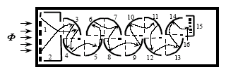 характеристики различных фотокатодов фирмы RCA (США): 1. сурьмяно-цезиевого; 2. оксидного; 3. мультищелочного; 4.6. сложных фотокатодов с отрицательным сродством к электрону. Kλ. квантовая эффективность фотокатода Наилучшими свойствами обладают так называемые фотокатоды с отрицательным сродством к электрону . полупроводниковые системы, в которых возбужденный в объеме фотоэлектрон выходит в вакуум без дополнительного потенциального барьера. В них Yк(hω) быстро достигает максимального значения, иногда более 0,5, и остается примерно постоянным в относительно широкой области. Спектральная характеристика ФЭУ с такими катодами может быть близка к П-образной. . В общем же случае можно ожидать самых разных форм спектральной зависимости чувствительности, в том числе и с выраженной структурой, как у оксидного фотокатода . Для технических целей часто используется такая характеристика ФЭУ, как спектральная чувствительность фотокатода. почти то же, что квантовый выход, но отнесена к энергии падающего излучения, а не к числу квантов, и приводится в единицах А/Вт. Например, для ФЭУ-130 (SbCsK-фотокатод, спектральная область 200.650 нм, максимум чувствительности . 400…420 нм) паспортная спектральная чувствительность на длине волны 410 нм (hω = 3.024 эВ) равна 0,03 А/Вт, т.е. квантовый выход фотоэмиссии Yк(3 эВ) = 0.091. Традиционно приводится и светотехническая характеристика . чувствительность фотокатода (интегральная, не спектральная), измеряемая в единицах А/лм. На рис. 2.7.8 приведены спектральные характеристики ряда ФЭУ американской фирмы RCA, имеющих стеклянные или увиолевые окна. Большинство отечественных ФЭУ имеют характеристики типа 1.3. Все фотокатоды по спектральной характеристике грубо можно разделить на три группы: . инфракрасные (оксидный катод, порог . 1,2 мкм); . УФ-видимые (сурьмяно-цезиевый и мультищелочные катоды с порогом 650.850 нм); . .солнечно-слепые. или просто .слепые., нечувствительные к видимому или даже ближнему УФ-излучению. Обычно их фотокатоды . металлы или простые двойные соединения. Например, полупрозрачный CsJ-фотокатод на окне из MgF2 чувствителен в области 112.210 нм (11.0.5.9 эВ), причем на 210 нм его чувствительность составляет всего 1% от максимальной (ФЭУ-154). В заключение отметим, что для каждого эксперимента нужно специально подбирать ФЭУ. Спектральная характеристика не должна простираться далеко в длинноволновую область, иначе будут чрезмерны термоэмиссионные темновые токи с фотокатода, пропорциональные exp(–ФT/kT). По этой причине ФЭУ с оксидным катодом применяют только в специальных случаях, когда необходима длинноволновая граница чувствительности. Если нужно работать только в ультрафиолете, предпочтение отдают сурьмяно-цезиевым или солнечно-слепым фотокатодам. 5.6Область приминения Применений ФЭУ (оптические дальномеры, лазерные локаторы, астронавигационная аппаратура и т. п.) 6.2Метод вывода информации с помощью фотоприёмных матриц Матрица фотоприёмников (фотоматрица) служит для преобразования оптического изображения в электрические сигналы, причём каждый элемент функционирует как пороговый детектор, указывающий наличие или отсутствие светового сигнала в соответствующей позиции. Различают два режима работы фотоприёмников: режим непосредственного отсчета и режим накопления заряда. В первом случае выходной электрический сигнал фотоприёмн