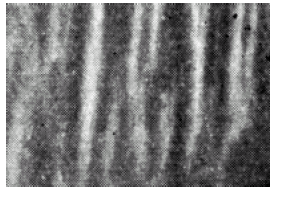 2.6 Вывод: перспективы развития. Важная особенность фотодиодов – высокое быстродействие. Они могут работать на частотах до нескольких миллио нов герц. Фотодиоды обычно изготовляют из германия или кремния. Фотодиод является потенциально широкополосным приемником. Этим и обуславливается его повсеместное применение. В будущем крайне важно повышение рабочей температуры фотодиодов. Оценивая сегодняшнюю оптоэлектронику в целом, можно сказать, что она скорее «криогенная», чем «комнатная». Будущее оптоэлектроники находится в прямой зависимости от прогресса фотодиодных структур. Оптическая электроника бурно развивается, разрабатываются новые типы фотоприемников, и наверняка уже скоро появятся фотодиоды на основе новых материалов с большей чувствительностью, повышенным быстродействием и с улучшенными характеристиками в целом. 3.1.ЛАВИННЫЕФОТОДИОДЫ НА ОСНОВЕ СВЕРХРЕШЕТКИ InSb-InSbBi Волгодонский институт ЮРГТУ (НПИ), г. Волгодонск, ул. Ленина 73/94, тел.: 25668 Анализ физических свойств гетеропереходов, проведенный нами для гетероструктур InSbBi/InSb, показал, что причиной возможной деградации частотных характеристик и добротности фотодетекторов с использованием этих твердых растворов могут быть скачки в зонной структуре гетероперехода. Эффективность гетероперехода со скачком потенциала в валентной зоне на гетерогранице ∆Е пропорциональна exp ( ∆Е/kT), где ∆Е = Еg1 - Еg2 - ∆Е0 Захват носителей приводит к замедлению релаксации фототока с постоянной времени τ ~ exp( ∆Е / kT) ≥ 10 нс, что существенно снижает быстродействие фотоприемников. Значение ∆Е для гетероперехода InSb0.98Bi0.02/InSb составляет около 0,05 эВ. Сглаживание гетеропереходов достигается применением буферных слоев постоянного или переменного по толщине состава[1]. Оптимальным вариантом здесь могут оказаться сверхрешеточные структуры, варизонность которых сохраняется на больших длинах ~ 1,5 мкм. Для реализации этой задачи нами были получены с помощью методики[2] двойные гетероструктуры InSb – InSbBi. Согласно[3], рост Bi-содержащих твердых растворов может происходить как автоволновый концентрационный процесс в условиях потери устойчивости фронтом кристаллизации. Нами был получен ряд образцов, состоящих из чередующихся слоев InSb и InSb0.985Bi0.015. Перекристаллизация осуществлялась при Т = 693 К, grad T = 30 К/cм движением плоской жидкой зоны усредненного состава In0.45Bi0.55 со скоростью (6539 10) мкм/час. Общая толщина эпитаксиальной пленки InSb-InSbBi составляла около 5,5 мкм. На рис. 1 приводится электронная микрофотография поверхности выращенных образцов. Как отдельные слои, так и структура в целом обладают высокой планарностью, толщины разных слоев близки. Слои InSb, чередующиеся со слоями InSbBi, образуют правильную периодическую структуру с периодом TSL = 120 нм. Центр эпитаксиальной структуры либо свободен от дислокаций несоответствия, либо содержит их незначительное количество. Измерение удельного сопротивлениячетырехзон-довым методом показало, что концентрация висмута по диаметру эпитаксиальных структур не изменялась. Поэтому можно считать, что увеличение плотности дислокаций несоответствия связано с радиальными градиентами в процессе роста структур, что обуславливает градации интенсивности на электронной микрофотографии.